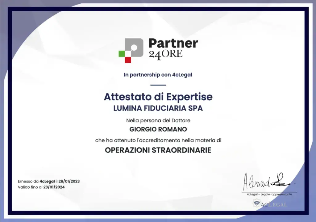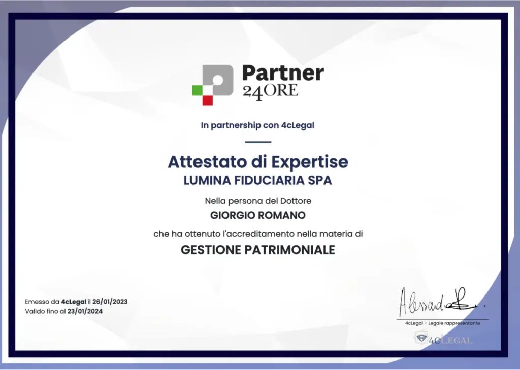 Lumina Fiduciaria SpA è Business Partner 24 ORE, il network di Professionisti e Aziende specializzate che condividono le proprie competenze per metterle a disposizione delle aziende che dovessero avere specifiche necessità.